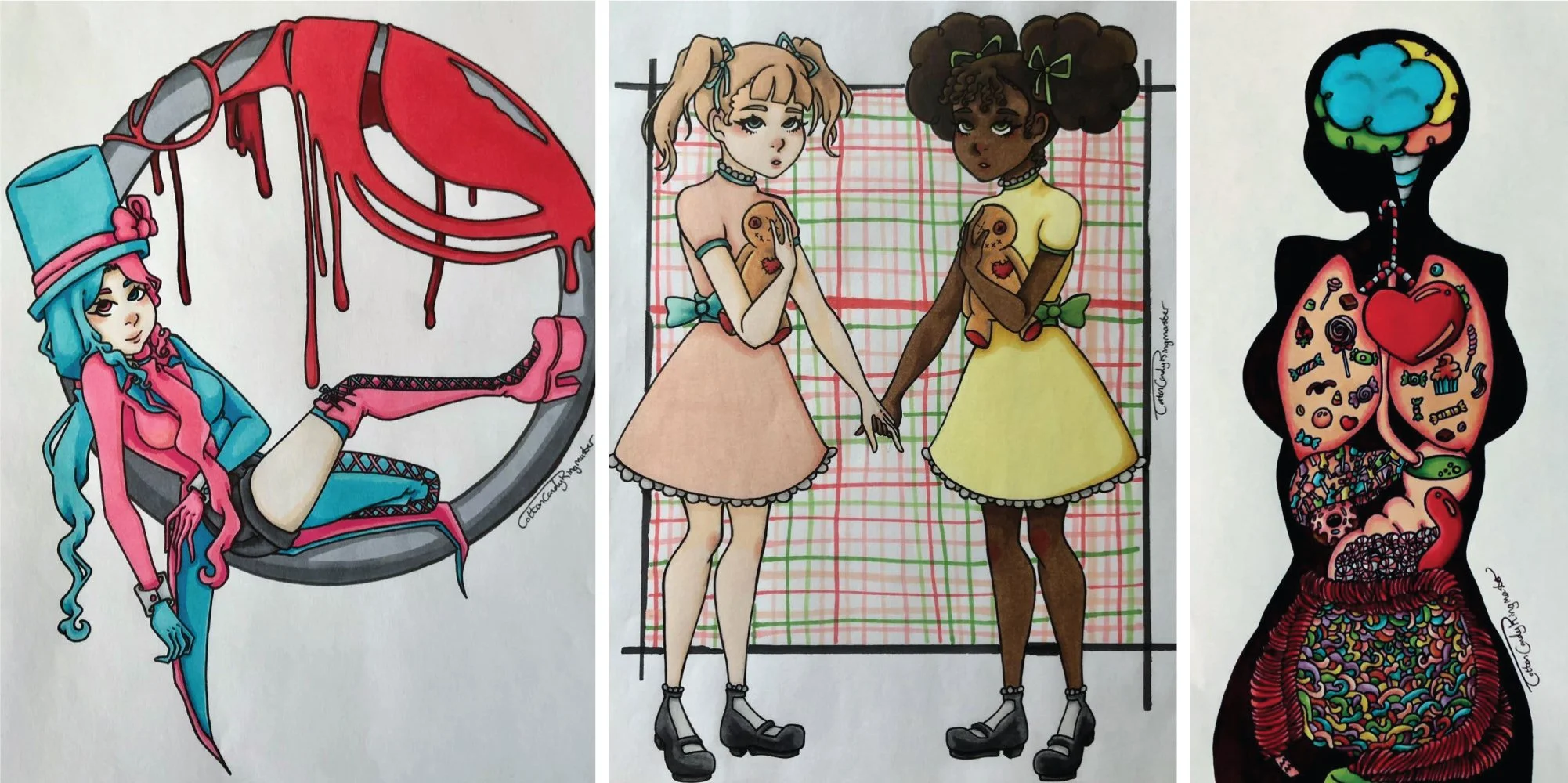 I would like to end the interview by saying that the art I post and the art I will be displaying is only a fraction of my creative ability. I chose to stick with specifically writing and drawing under this pseudonym, but I also cosplay, make jewelry and do many other creative works. I just prefer to streamline it all under CeCe Renee (Cotton Candy Ringmaster) on Instagram to make it more aesthetically pleasing. I don’t currently have commissions open or sell my art, but I would love to eventually make a zine or publish a comic.
