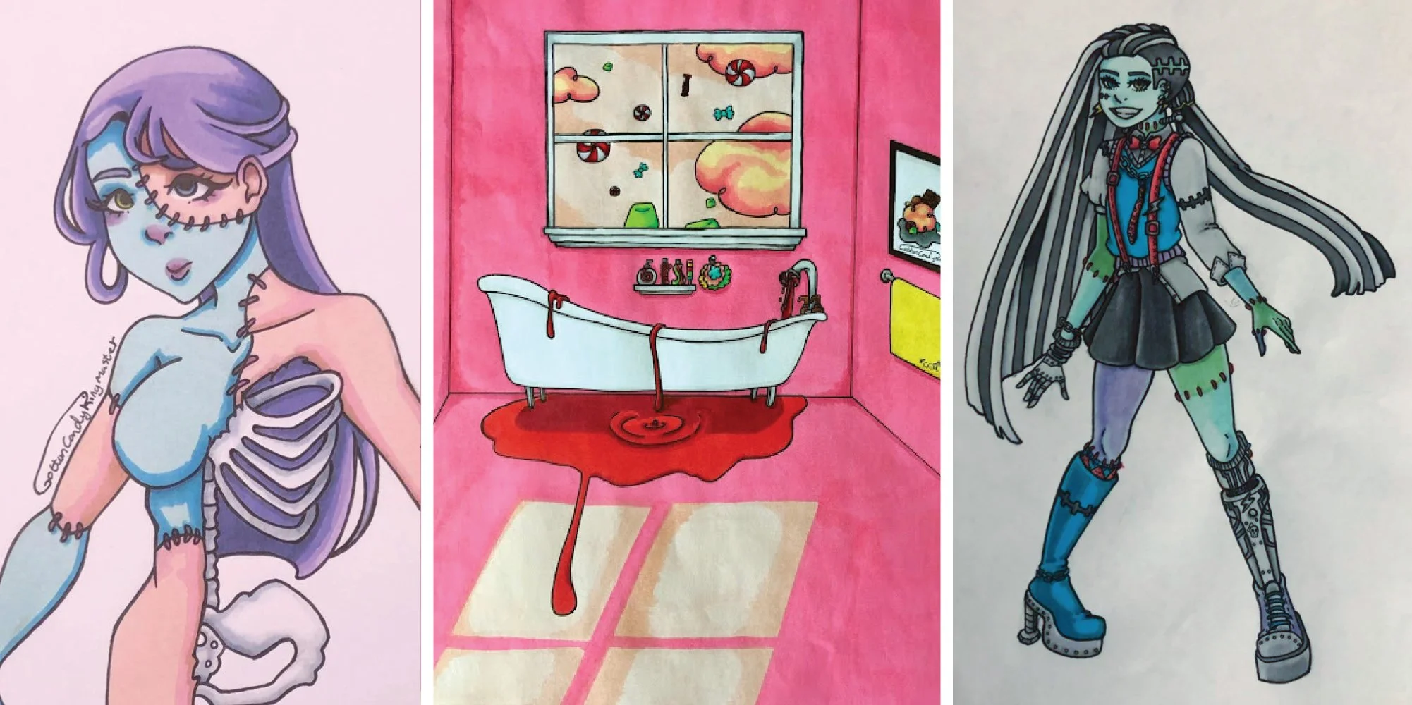My artwork is actually very different from my regular personality. I’ve always struggled with how to word it, but I feel like the best way to describe it is that I make the art I wanted to see. I loved the edginess of the majority of cartoons and anime I watched while growing up, but I always had a more cutesy art style. When I formed my art style things like pastel goth weren’t really common so I created what I wish I could have owned and displayed by my desk to inspire my work. This is also why I chose to go under a fake artist name for when I create, since CeCe Renee is such a different person from the real me and so different from what I usually create.